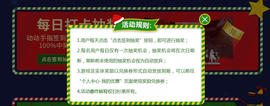 只要注册并登陆杉果平台,玩家就可以参加每日打卡抽奖活动。玩家可以在抽奖中获得各种奖励兑换券,还有机会直接获得游戏或实体奖励。