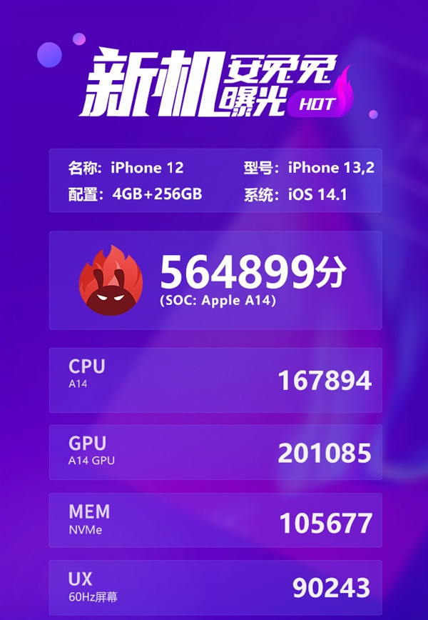 iPhone 12的总分为564899分,其中CPU成绩为167894分、GPU成绩为201085分、MEM成绩为105677、UX成绩则是90243分。