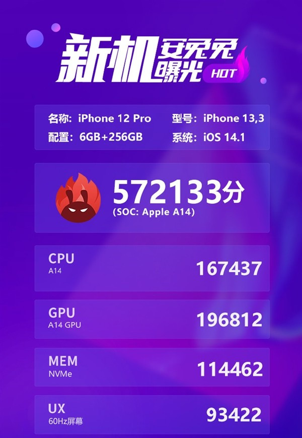 iPhone 12 Pro的总分为572133分,其中CPU成绩为167437、GPU成绩为196812分、MEM成绩为114462分、UX成绩则是93422分。