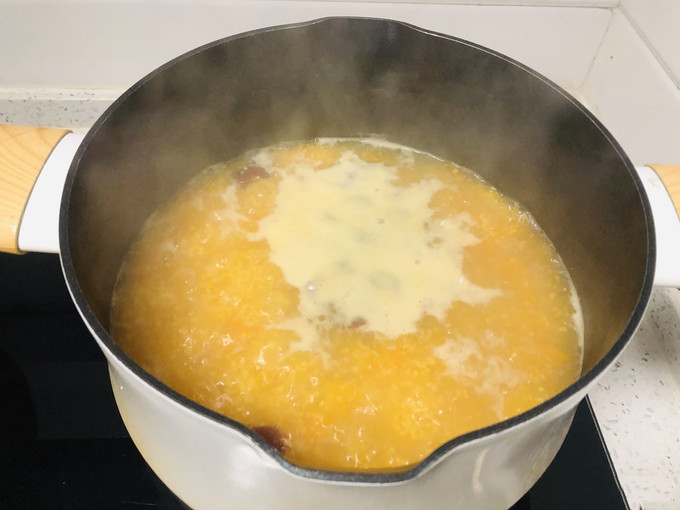 4、南瓜煮烂之后,开水直接下入泡好水的小米,然后加入1勺食用油,这个是我家奶奶常用的“秘方”,加入食用油之后,煮出来的小米粥喝起来特别爽滑,但是不能多放。