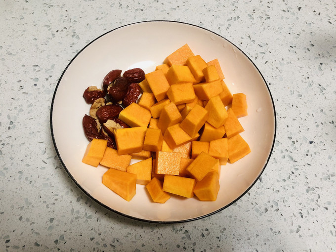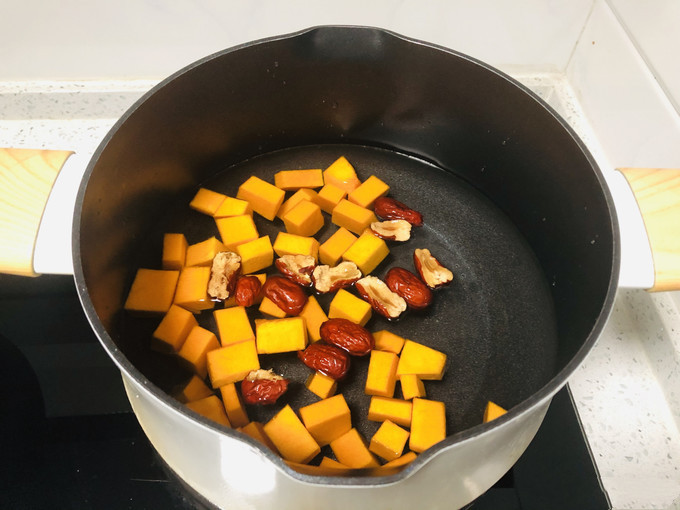 3、红枣去掉枣核,南瓜去掉外皮和瓜瓤部分,然后切成丁,凉水下入锅中,水开之后煮5分钟,把南瓜煮至软烂。