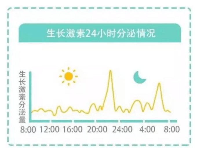 在一天的时间里,生长激素分泌是有规律的,熟睡后会进入高峰期,分泌量是白天的3-5倍左右。所以,生长发育期的孩子,一定要早睡,还要睡足。