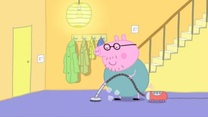 首先是猪爸爸猪妈妈的家庭分工。还是《停电》这一集。在这一集的开头,猪爸爸在打扫卫生,猪妈妈在工作,佩奇和乔治在跟着电视跳舞。