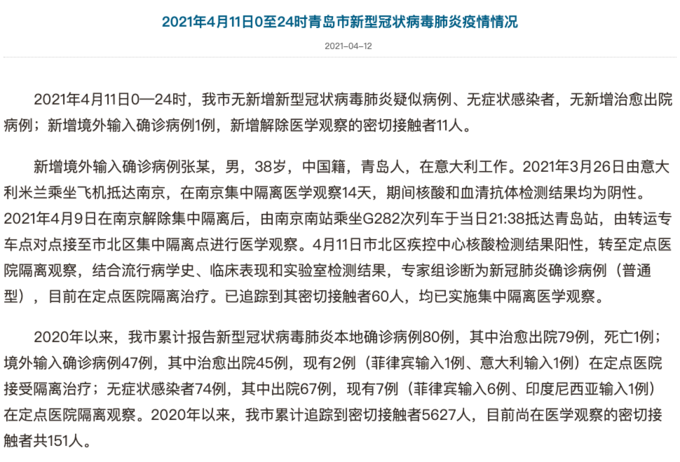 张某,男,38岁,中国籍,青岛人,在意大利工作。2021年3月26日由意大利米兰乘坐飞机抵达南京,在南京集中隔离医学观察14天,期间核酸和血清抗体检测结果均为阴性。2021年4月9日在南京解除集中隔离后,由南京南站乘坐G282次列车于当日21:38抵达青岛站,由转运专车点对点接至市北区集中隔离点进行医学观察。4月11日市北区疾控中心核酸检测结果阳性,转至定点医院隔离观察,结合流行病学史、临床表现和实验室检测结果,专家组诊断为新冠肺炎确诊病例(普通型),目前在定点医院隔离治疗。已追踪到其密切接触者60人,均已实施集中隔离医学观察。
