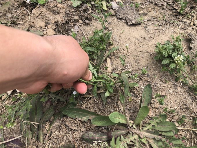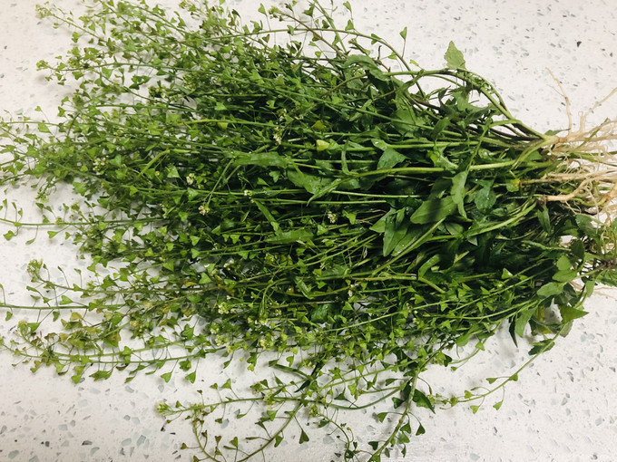 开花的老荠菜,去掉上边干枯的叶子,然后用清水反复清洗几遍,洗干净上边的泥土。