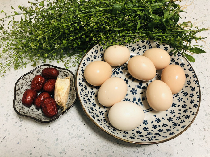 食材:开花荠菜、土鸡蛋、生姜、红枣、盐、白醋