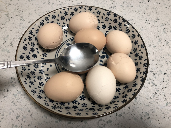 鸡蛋煮好之后捞出,然后拿个汤勺,把鸡蛋的表壳挨着敲碎,方便我们在煮的时候入味儿。