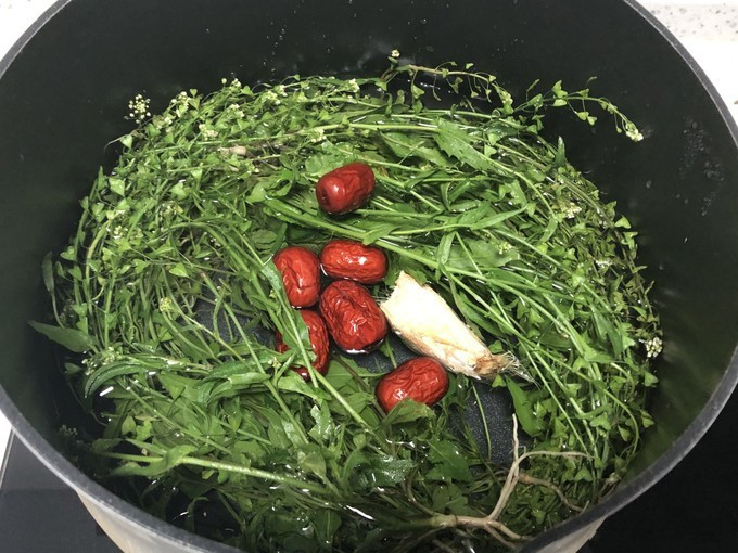 锅里重新加水,然后放入清洗干净的荠菜,加入一块老姜、几个红枣,大火烧开之后转小火慢煮,一直把荠菜里边的汁液煮出来。
