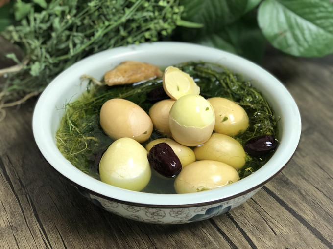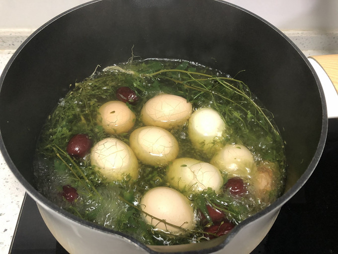 等到荠菜煮变色之后,加入敲破壳的鸡蛋,继续煮5分钟,然后关火,加入少许的食盐调味,浸泡一夜就可以了。