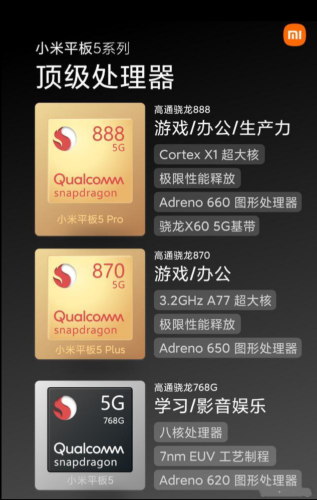 小米平板5系列有小米Pad 5,小米Pad 5 Plus和小米Pad 5 Pro三款,核心配置已曝光,从低到高分别搭载骁龙768G、骁龙870和骁龙888,最顶级的小米Pad 5 Pro居然搭载骁龙888,怪不到此前有消息称,新的平板不止骁龙870。