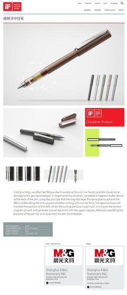 iF 设计奖,简称“iF”,创立于1953年,该奖是由德国历史最悠久的工业设计机构--汉诺威工业设计论坛(iF Industrie Forum Design)每年定期举办的。素有“产品设计界的奥斯卡奖”之称。国际巨头齐聚iF,并展示最新的设计产品。晨光文具磁悬浮中性笔Magneter在近万件作品中脱颖而出,得到了来自各个领域的国际知名设计师的一致认可,更展现了中国文具制更展现了中国文具制造迈向国际化的非凡实力。