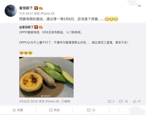 4月22日,微博有位数码博主爆料称,OPPO将于5月6日发布新品智能电视,定位入门级别,并表示“OPPO认为不上量不行了”,后又补充道;如果预算有限,可以等那天新品发售,应该是个惊喜...猜测此次新品电视定价不会太高。
