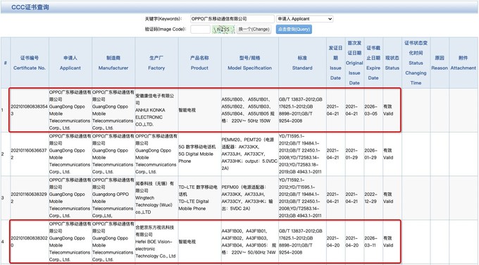 据在国家3C证书网站上查询到的信息了解,OPPO两款入门级新品电视疑似为为A43系列和A55系列,在4月20日和4月21日,已经分别获得了两大型号智能电视的认证证书。不过不同的是,认证显示A43系列由合肥京东方视讯科技有限公司生产,A55系列则由安徽康佳电子有限公司生产。