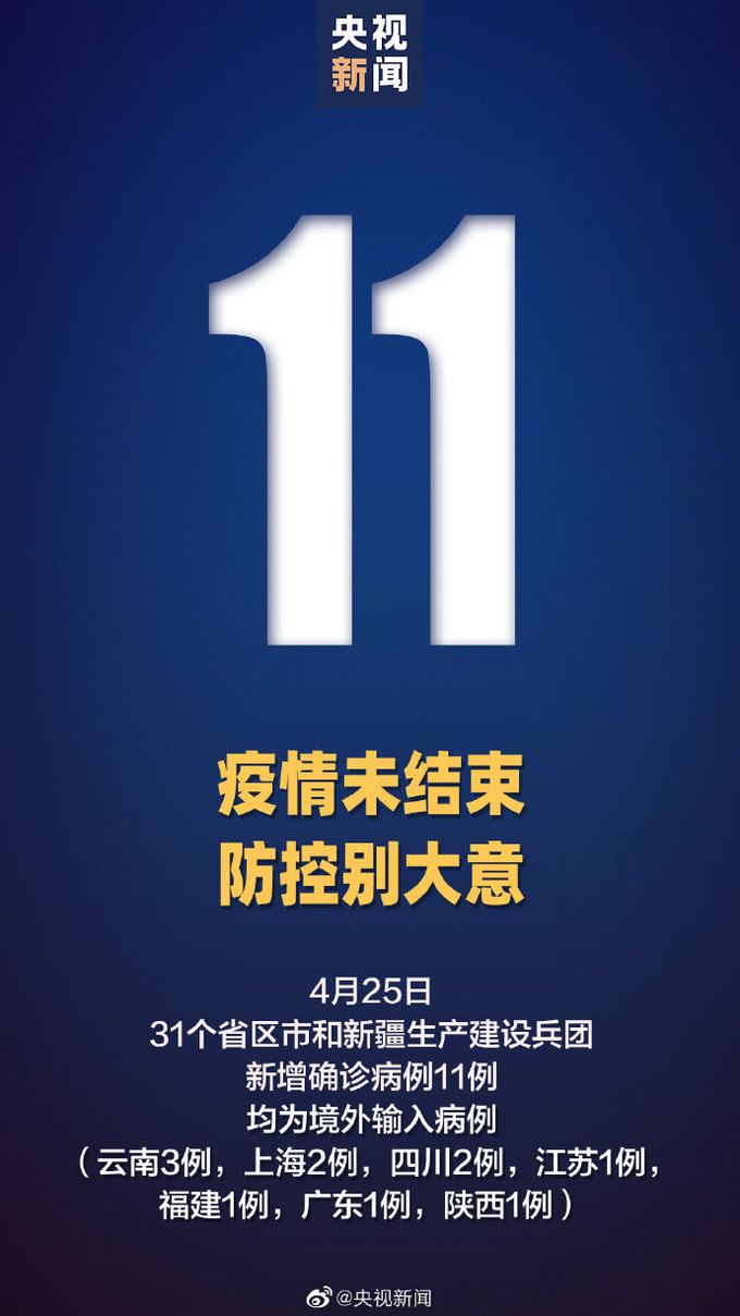 4月25日0—24时,31个省(自治区、直辖市)和新疆生产建设兵团报告新增确诊病例11例,均为境外输入病例(云南3例,上海2例,四川2例,江苏1例,福建1例,广东1例,陕西1例);无新增死亡病例;无新增疑似病例。