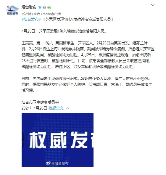 据@烟台发布4月25日,山东烟台芝罘区发现1例入境确诊治愈后复阳人员。