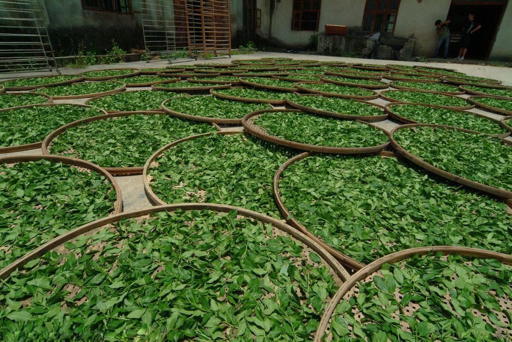之后便用工具使其迅速降温,让水分在此时蒸发,同时也是为了避免余热和水气把芽叶变黄,凉却后进行摊晾,把蒸好的茶叶放到100~140摄氏度的焙炉盘是上进行“铲头毛火”,双手捧叶高抛,不停抖散,让水分蒸发。这样“抛炒”至叶色暗绿,中间茶梗出现皱纹,然后用手捏茶胚,反复操作持续15分钟左右。之后则是与其他茶叶制作过程总没太大差别的揉捻。