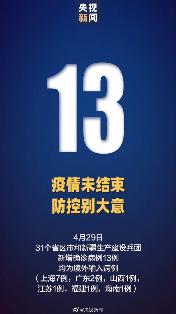 4月29日0—24时,31个省(自治区、直辖市)和新疆生产建设兵团报告新增确诊病例13例,均为境外输入病例(上海7例,广东2例,山西1例,江苏1例,福建1例,海南1例);无新增死亡病例;新增疑似病例3例,均为境外输入病例(上海2例,内蒙古1例)。