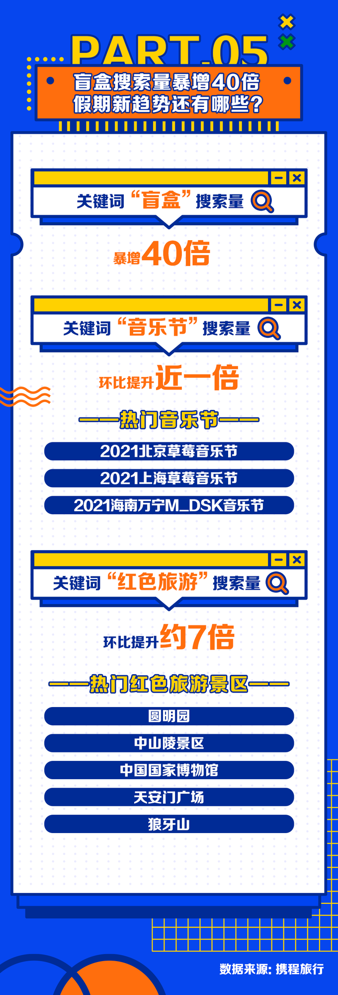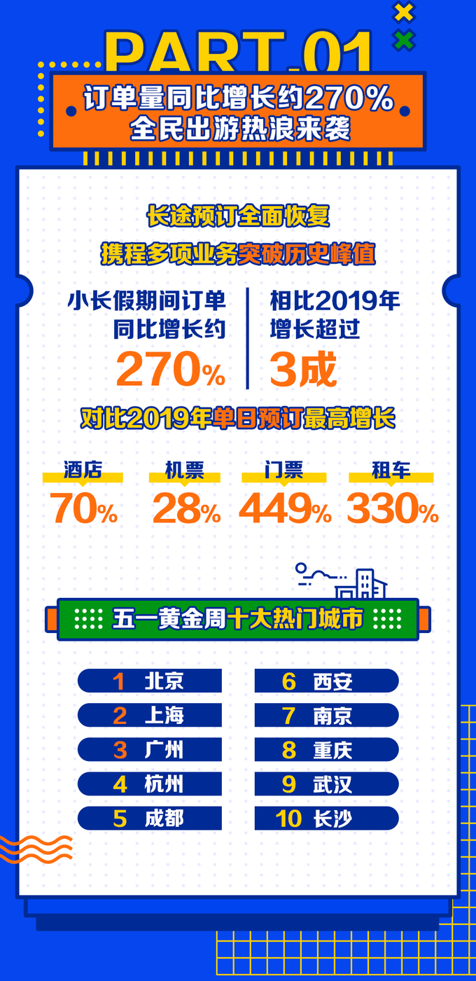 5月5日,携程也联合新华财经发布《2021“五一”旅行大数据报告》,以多维度数据展现“五一”黄金周期间国内旅游市场的强势复苏。具体如下: