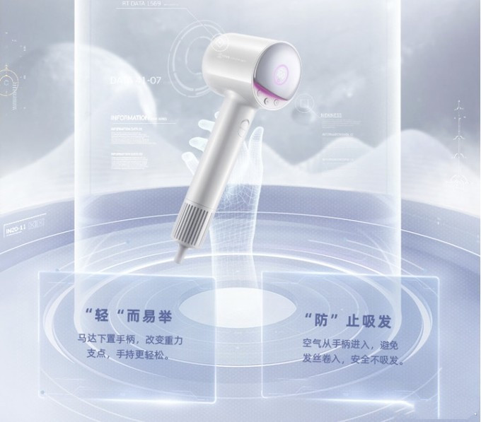 外观方面,采用人体工学平衡手柄设计,手持更加轻松,同时使用安全不吸发。配备双层磁吸扩散风嘴和双层磁吸顺滑风嘴,可随心选择,打造心仪发型。