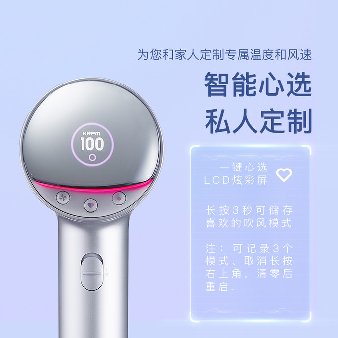 有三档风速和四档风温可调,能实现高达15种风温风速组合,适合不同的家庭成员,用户可一键选择心选模式,为每一个家庭成员智能“定制”头发护理模式。
