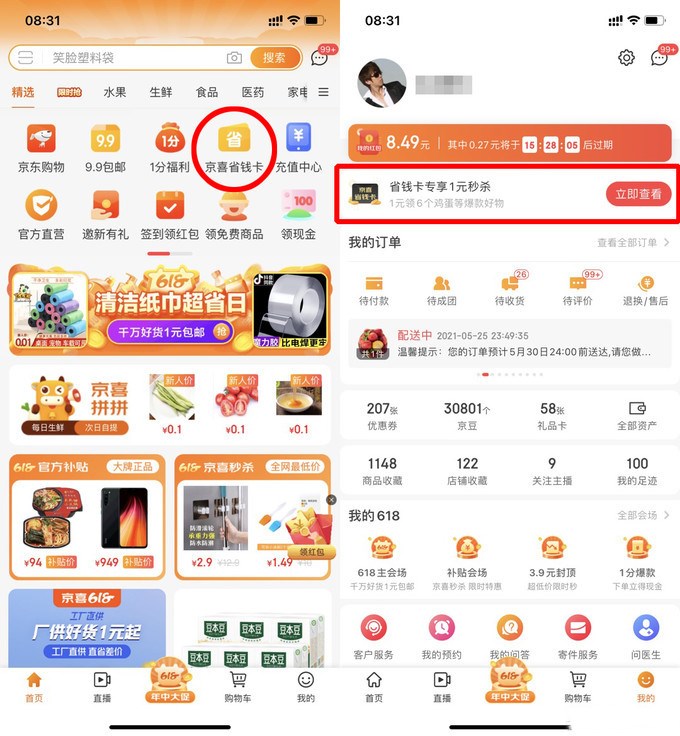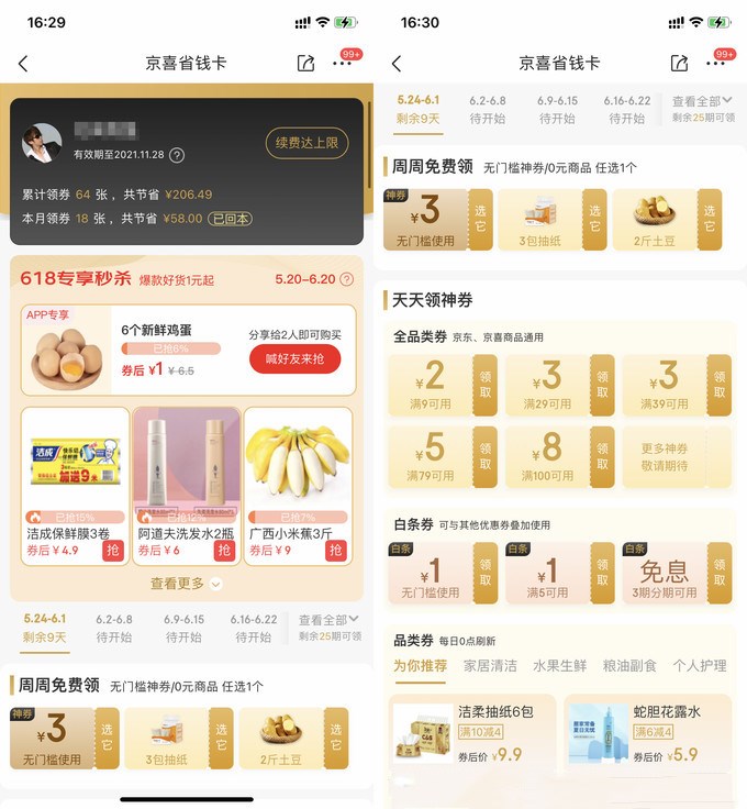 买完卡后,领券可以从购买二维码进入领取,或者京喜APP“首页”和“我的”页面都有入口: