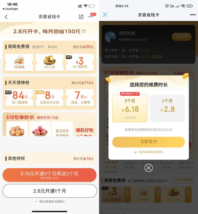 点击上面直达连接开通京喜省钱卡,正常价是2.8元1月,6.18元3月,经常会搞活动,开通和续费买1送1或买3送3: