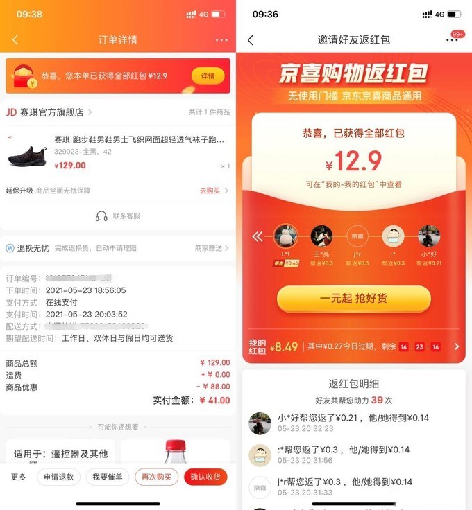 在京喜APP或京喜小程序下单,部分商品是有返红包的,但有没有返红包要付款完成后才可以看到,付款完成后有返红包的一般会自动弹出来,或者在订单详情里也可以看到,是的,这个红包需要拉人助力才可以得,但是有一个人助力就能得一份红包,并不需要全部弄完,有多少人力返多少红包。至于多少红包要多少人,这个一直在变,学士下面的12.9元用了39人仅供参考。这个红包只能在京喜里用,但是全品类可用,不管是否自营,不管是否拼购,全品可用。