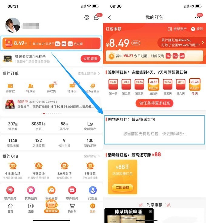 或者在京喜APP-我的顶部的红包栏进入也可以看到正在返的红包,这个红包栏还有个妙用,就是可以看到有多少红包在多少时间后要过期,提醒你安排用。
