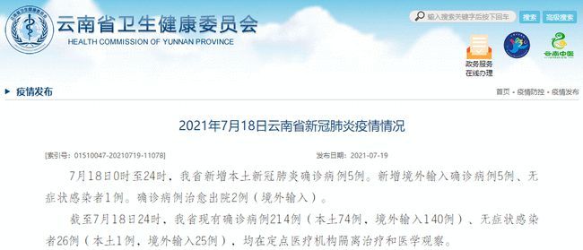 南省卫生健康委员会7月19日通报,18日0时至24时,云南省新增本土新冠肺炎确诊病例5例。新增境外输入确诊病例5例、无症状感染者1例。确诊病例治愈出院2例(境外输入)。