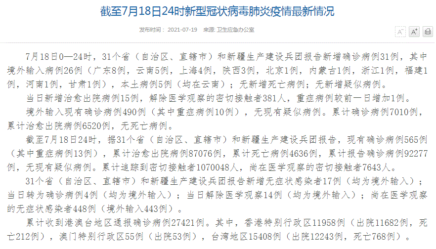 根据中国国家卫健委7月19日最新通报,7月18日0—24时,31个省(自治区、直辖市)和新疆生产建设兵团报告新增确诊病例31例,其中境外输入病例26例(广东8例,云南5例,上海4例,陕西3例,北京1例,内蒙古1例,浙江1例,福建1例,河南1例,甘肃1例),本土病例5例(均在云南);无新增死亡病例;无新增疑似病例。