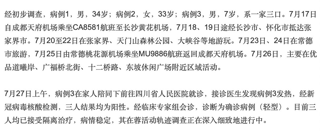 7月28日早上,成都发布消息,截止7月27日24时,成都市新增报告新冠肺炎本土确诊病例3例。疫情发生后,成都市立即启动应急处置预案,迅速进入应急状态,开展疫情处置工作。活动轨迹如下: