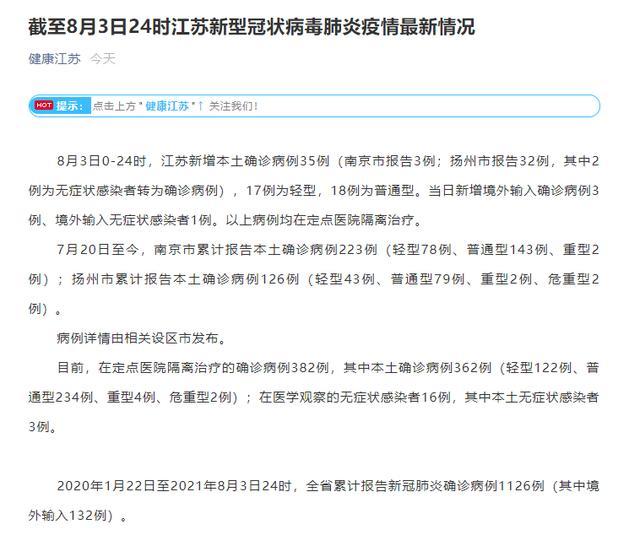 据人民日报报道,8月3日0-24时,江苏新增本土确诊病例35例(南京市报告3例;扬州市报告32例,其中2例为无症状感染者转为确诊病例),17例为轻型,18例为普通型。当日新增境外输入确诊病例3例、境外输入无症状感染者1例。以上病例均在定点医院隔离治疗。