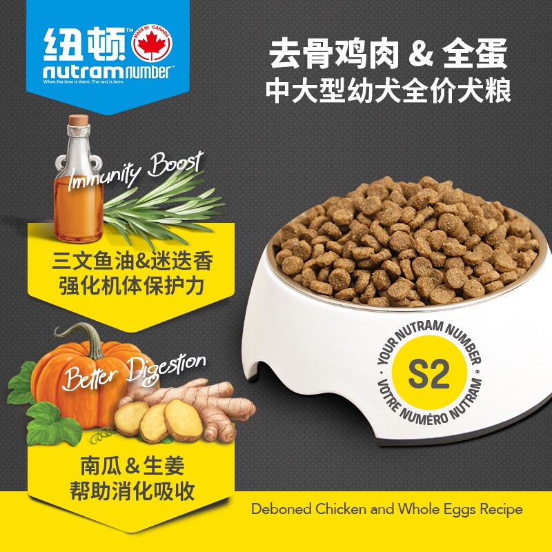 【直播间有券】纽顿nutram狗粮 中大型幼犬成犬全价狗粮宠物主粮 低敏系列加拿大进口 S2幼犬粮11.4kg【鸡肉&蛋】