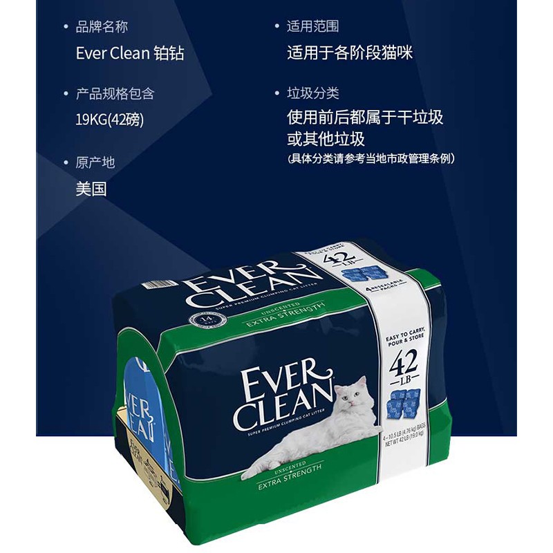 蓝标铂钻(EverClean)猫砂宠物膨润土猫砂 进口猫厕所幼猫成猫结团活性炭低敏砂42磅 清香猫砂(绿白标)42磅