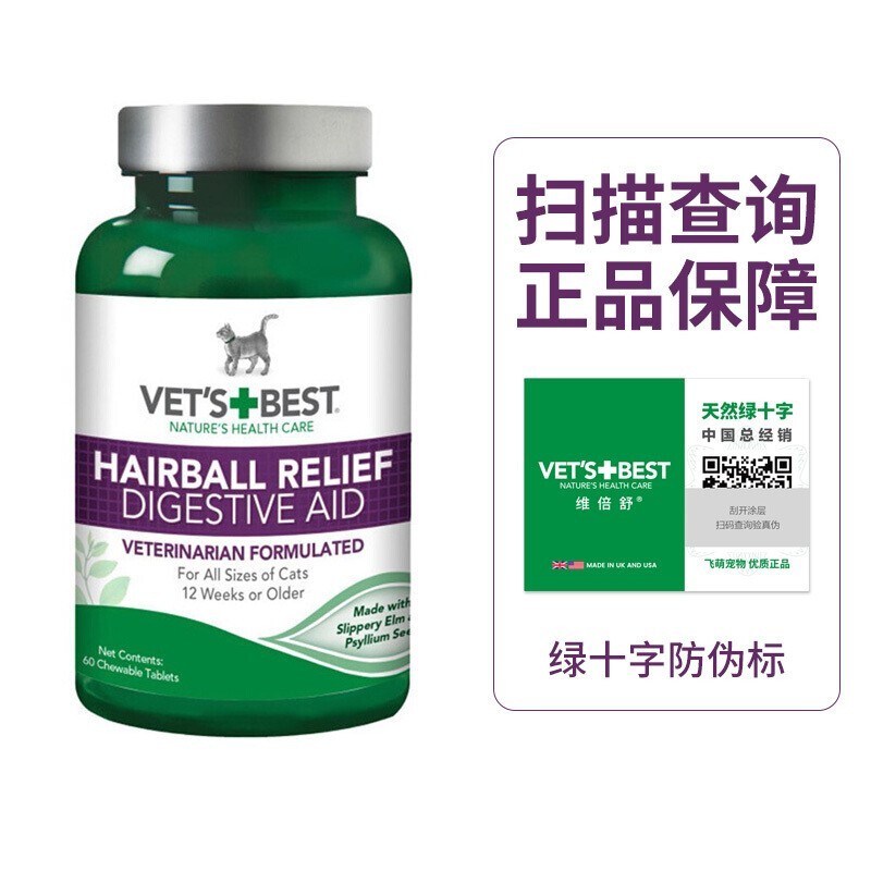 Vet's Best绿十字猫草片美国进口猫咪化毛球片成猫幼猫化毛膏肠胃调理预防便秘减少吐毛球 60片/瓶*3