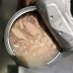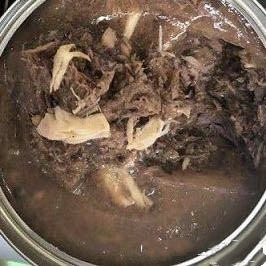 现在市面上的宠物罐头除去品牌不说,大概可以分为三类,第一类是配料表里明确标明添加了食用胶的,从罐头的表面能看到厚厚的一层胶状物质